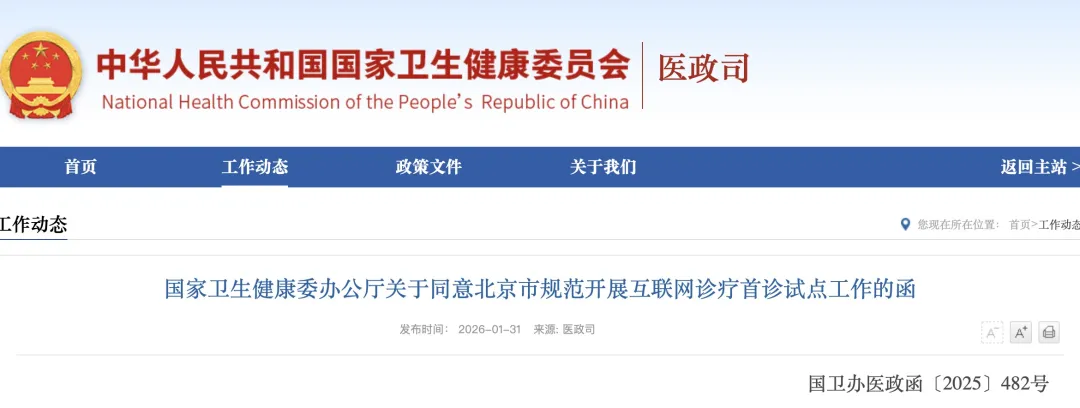1月31日,国家卫生健康委发布《关于同意北京市规范开展互联网诊疗首诊试点工作的函》,为充分利用信息技术疏解北京非首都功能,满足外地患者就医需求、方便就医,同意北京市卫生健康委依托首都医科大学附属北京儿童医院和首都医科大学附属首都儿童医学中心开展儿童生长发育专业、儿童营养专业、儿童皮肤疾病专业互联网诊疗首诊试点,试点时间为一年。